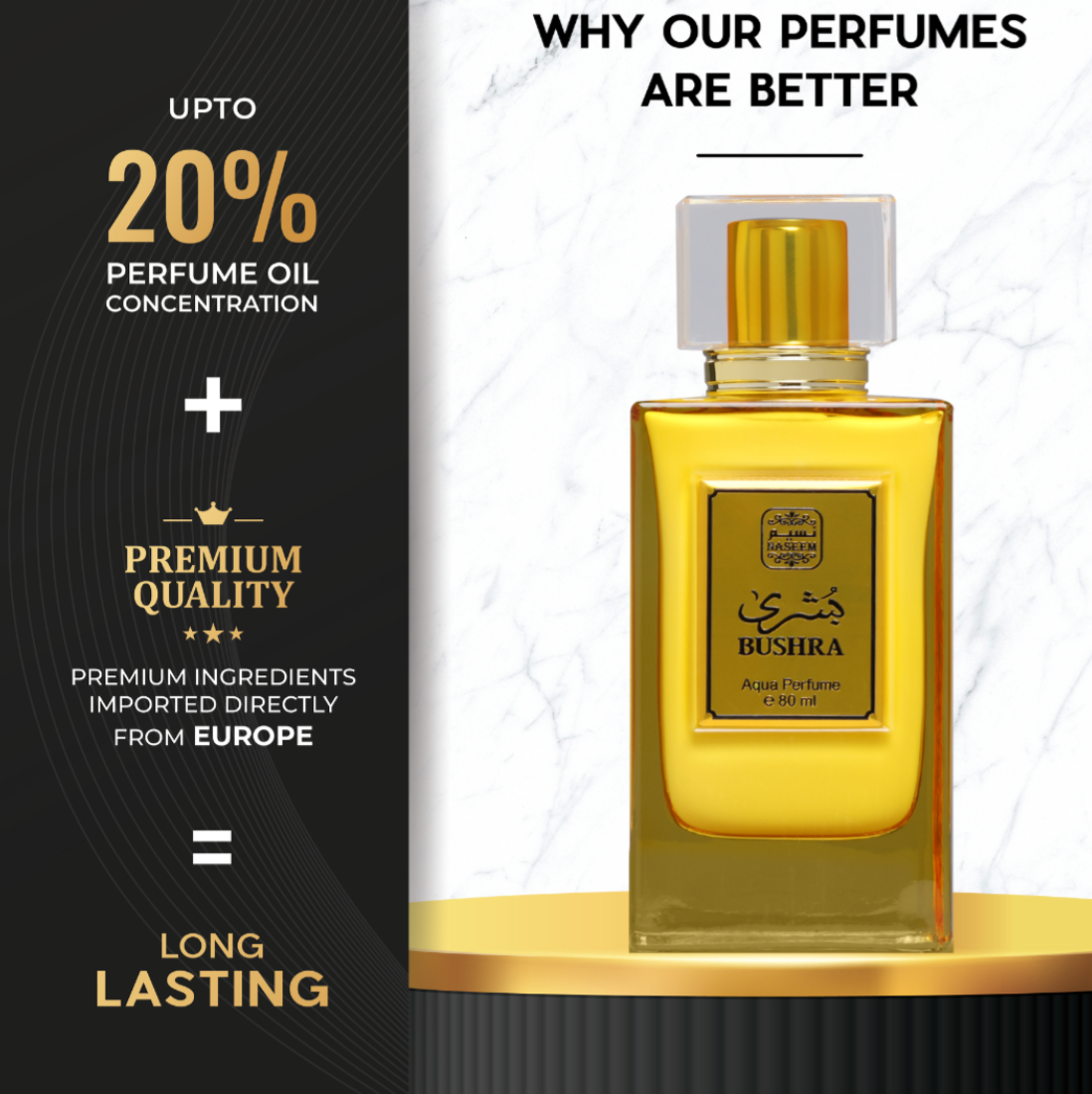 Bushra brings energy to life; its combination of sweet and sour is explosive, making any occasion fun and exciting. The fresh and uplifting citrus gives way to the sweetness in the heart which is complemented by the warm amber in the base, slowly intoxicating its user.