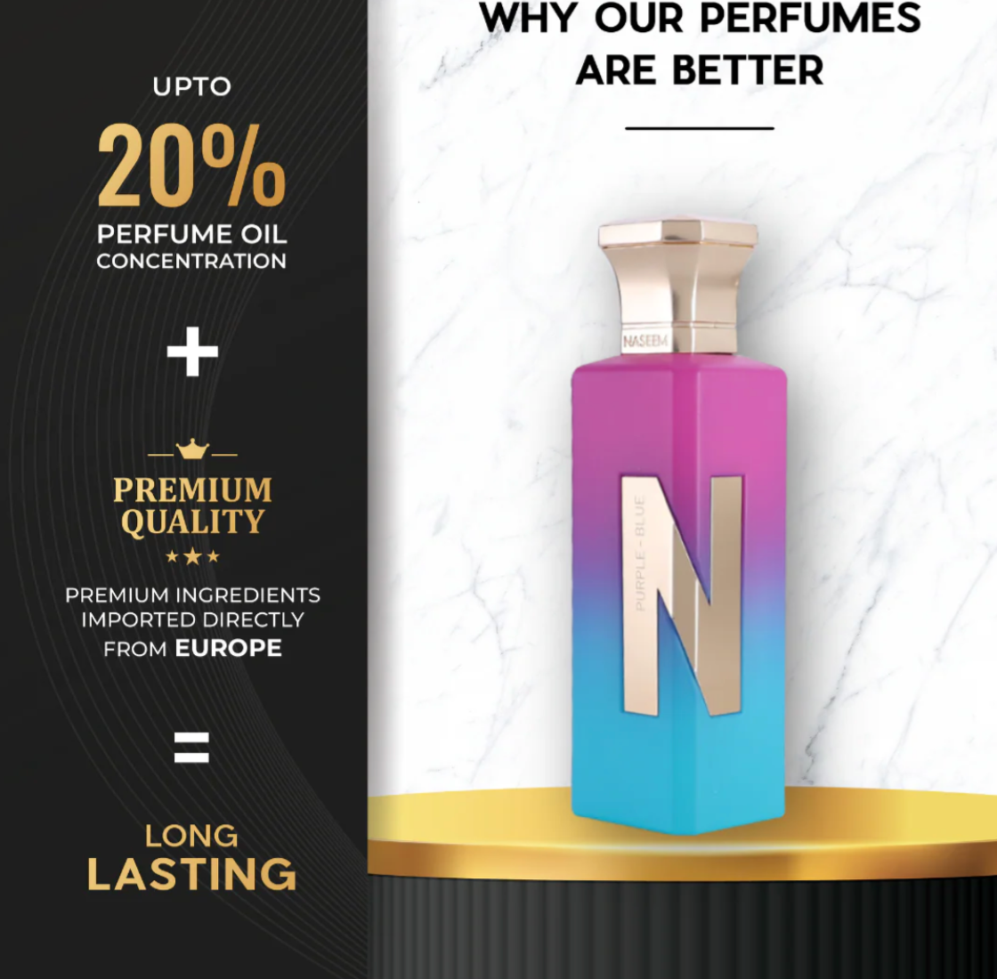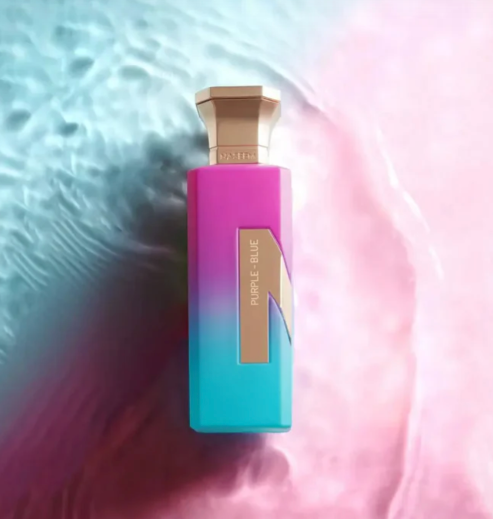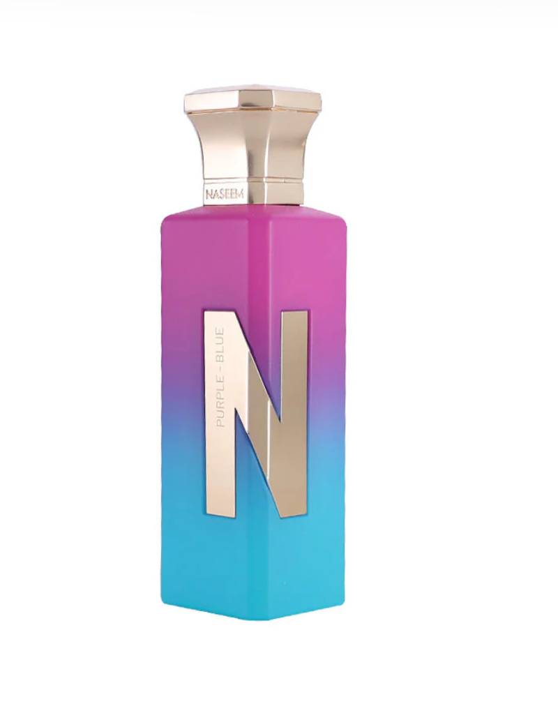 Naseem's Purple Blue opens with fresh watery pear and green apple, blended with sweet tropical fruits for an instant mood boost. Delicate jasmine and freesia flow into a calm white musk base, creating a serene, endlessly soothing scent.