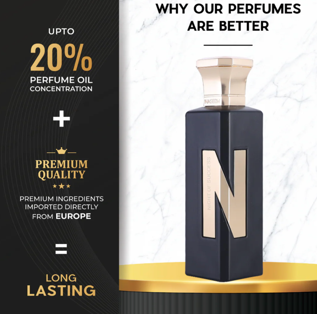 Night of Success opens with rich spices and indulgent plum, unfolds into rose and luxurious leather, and settles into a bold base of oud and warm amber—capturing the thrill and triumph of success.